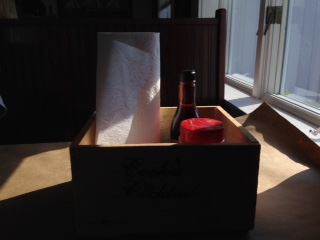 box at each table containing a roll of paper towels and condiments