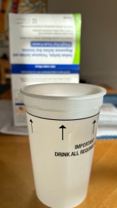 Part III:  The next morning (or the day of your colonoscopy) approximately 4 hours before your arrival time, repeat steps 1 – 4 with the Suprep Bowel Prep Kit.  I will now be on the second (last bottle) and all liquids must be completed 3 hours before my arrival time.  What I find difficult is that I now have barely anything in my stomach, I’ll most likely be feeling even more dizzy than I feel right now, and I still have to get all of that icky drink down as quickly as possible…