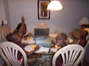 The kiddos at dinnertime – never a dull moment (smile) Here they are fighting over who gets control of the remote tonight.Here I am in my bedroom at the condo around 7pm where I would start losing energy and therefore get ready for bed…