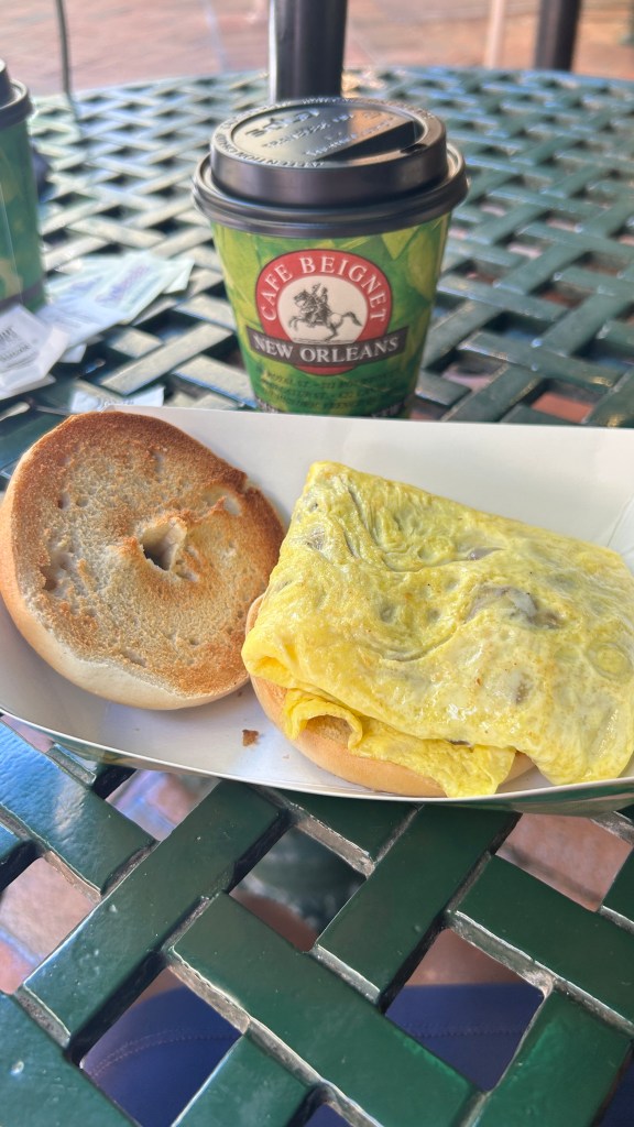 My Egg, Bacon and Cheddar Cheese Bagel sandwich with coffee